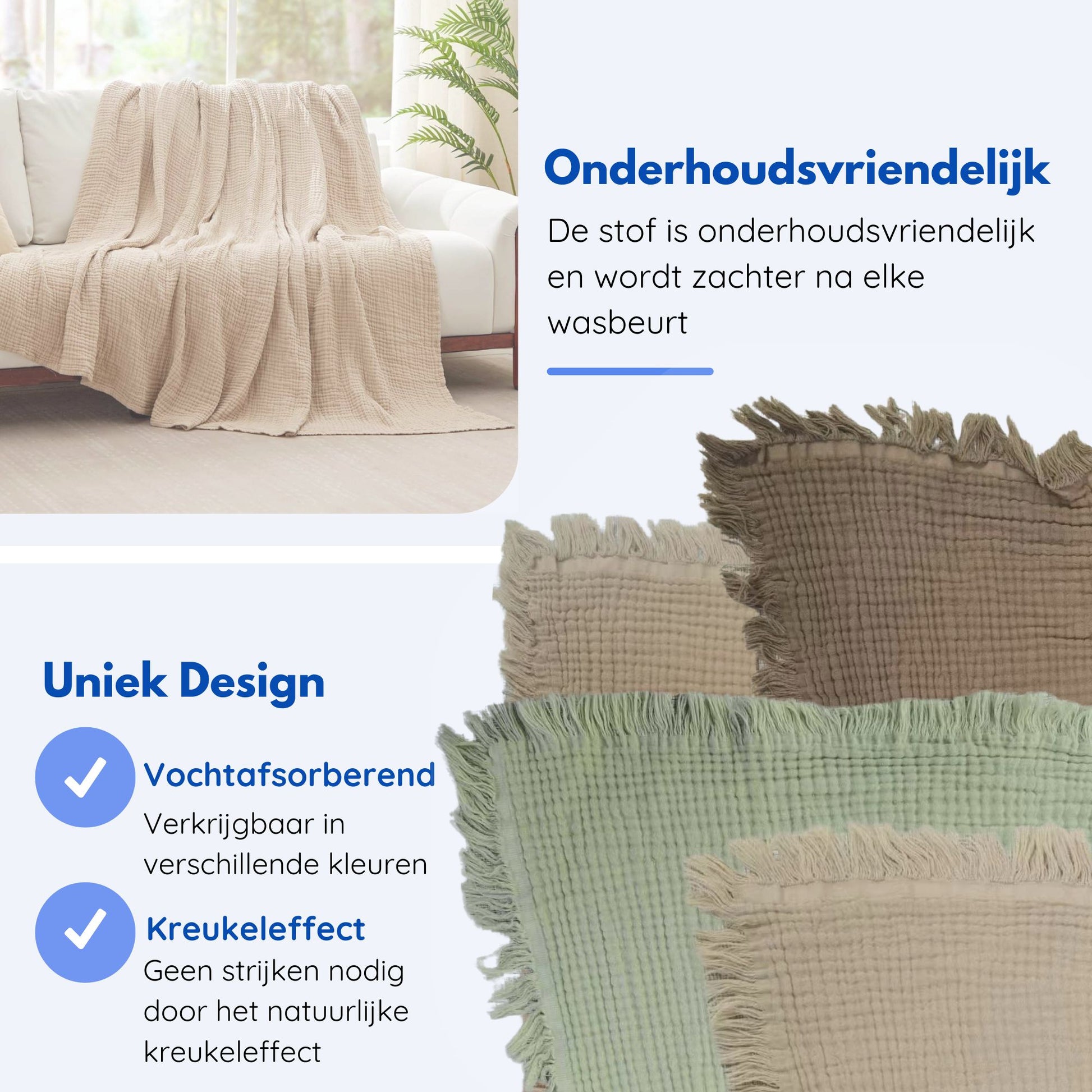 Gemaakt van ademend en luchtig katoen, deze deken is veelzijdig in gebruik en wordt zachter na elke wasbeurt. Omarm comfort en kwaliteit met de Hilvard mousseline deken!
