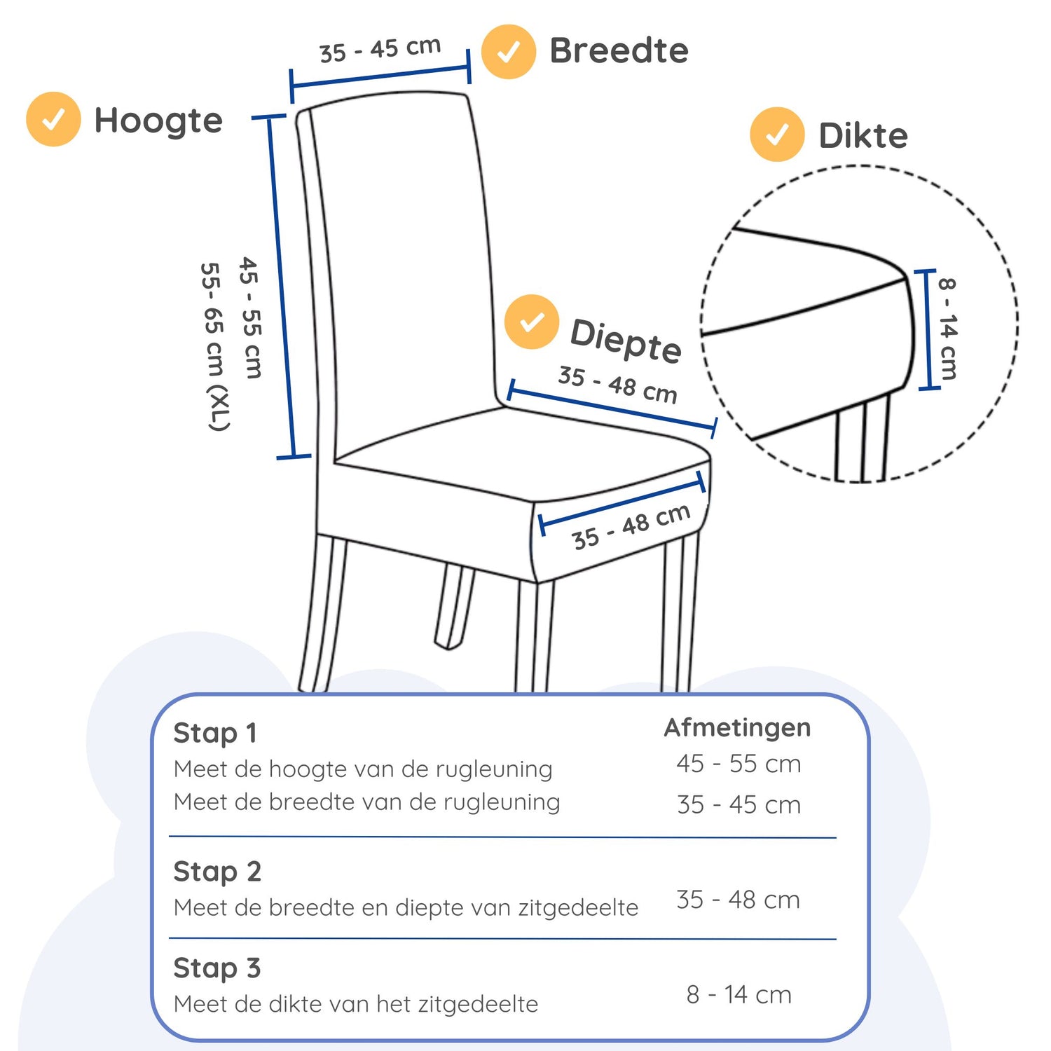De stoelhoes is uitermate geschikt voor een gemiddelde eetkamerstoel met een hoogte van 45 tot 55 cm en zitvlak tussen de 35 en 48 cm.